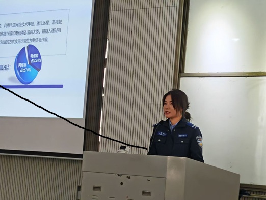 讲座分三大主题展开。郭佳佳警官通过真实案例解析新型电信网络诈骗手段,重点剖析"刷单返利""虚假征信"等常见骗局,现场演示国家反诈中心APP使用技巧;李文然教官通过视频演示与实物操作,系统讲授火场逃生技巧、灭火器分类使用方法;活动最后,校保卫处老师结合校园安全实例,详细讲解防盗防抢、实验室安全、突发事件应急处理等实用技能。
