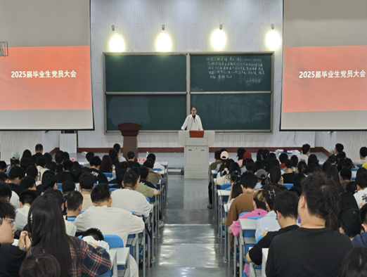 于繁塔楼大教室二召开2025届毕业生党员“最后一节党课”活动,本次党课由院党委副书记蔡镔主讲,全体毕业生党员共同参加。