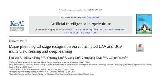 本网讯(通讯员岳继博)近日,我校智慧农业科技创新团队的研究成果“Maize phenological stage recognition via coordinated UAV and UGV multi-view sensing and deep learning”——在国际智慧农业领域知名期刊《Artificial Intelligence in Agriculture》在线发表。该研究提出了一种无人机(UAV)与地面无人车(UGV)协同的多视角感知策略,并结合自主设计的深度学习模型MSRNet,实现了对玉米12个关键物候期的精准识别,为作物育种中的高通量表型监测难题提供了创新解决方案。