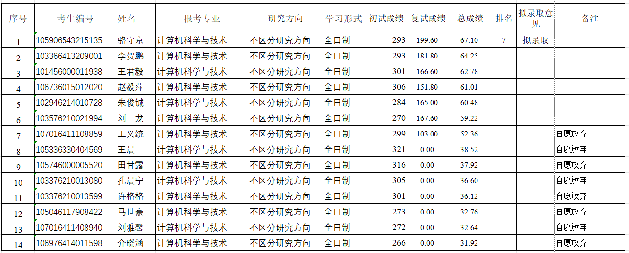 根据在线纸牌 2026年硕士研究生招生复试第一次调剂考生复试情况和管理科学与工程专业第二次开通调剂系统情况,经在线纸牌 研究生招生工作领导小组研究决定,计算机科学与技术专业拟增加1个招生计划数。按照计算机科学与技术专业调剂考生复试总成绩排名,顺次补录第七名考生:
